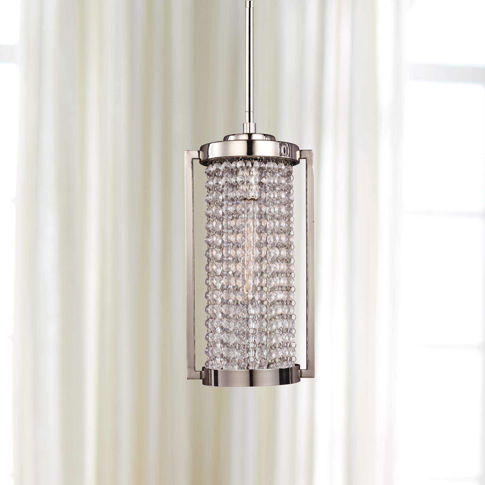 This contemporary polished nickel mini pendant is a fresh twist on a classic hanging lantern. A vertical, round-top stainless steel structure attached to a swivel mechanism frames strands of clear K9 crystal hung to evoke a cylinder shape, with a single light glowing from within. The overall silhouette is lantern-like but the sparkling, spinnable details are distinctive and unlike anything else you're bound to discover.