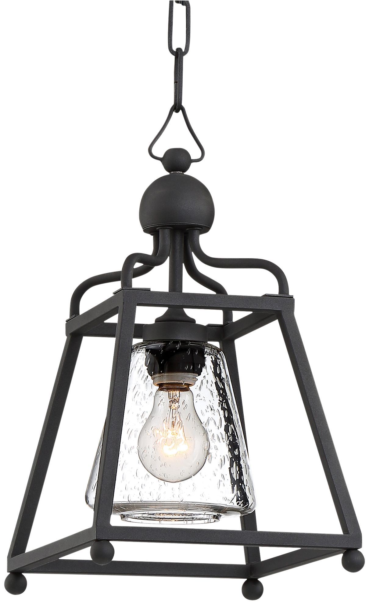 Illuminate your home with the stylish simplicity of the Sylvan collection, brought to you by Libby Langdon for Crystorama. This outdoor hanging light features a matte black forged finish and an attractive seeded glass shade. Its sleek design makes an inviting addition to any outdoor space.