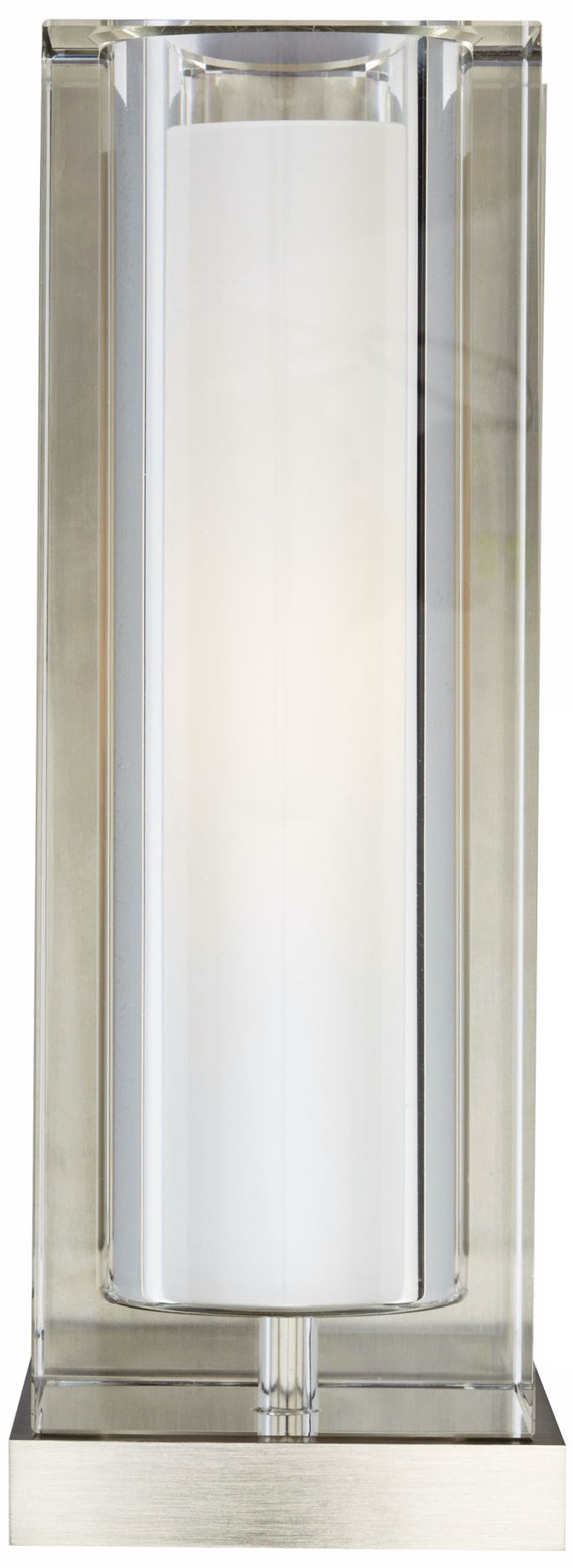 From Tech Lighting, the Jayden wall light features a block of clear, crystal glass that has been formed into a rectangular prism surrounding an inner diffuser. Glass and diffuser sit atop a die-cast metal base with a satin nickel finish. Sleek, stylish piece adds modern flair to your decor.