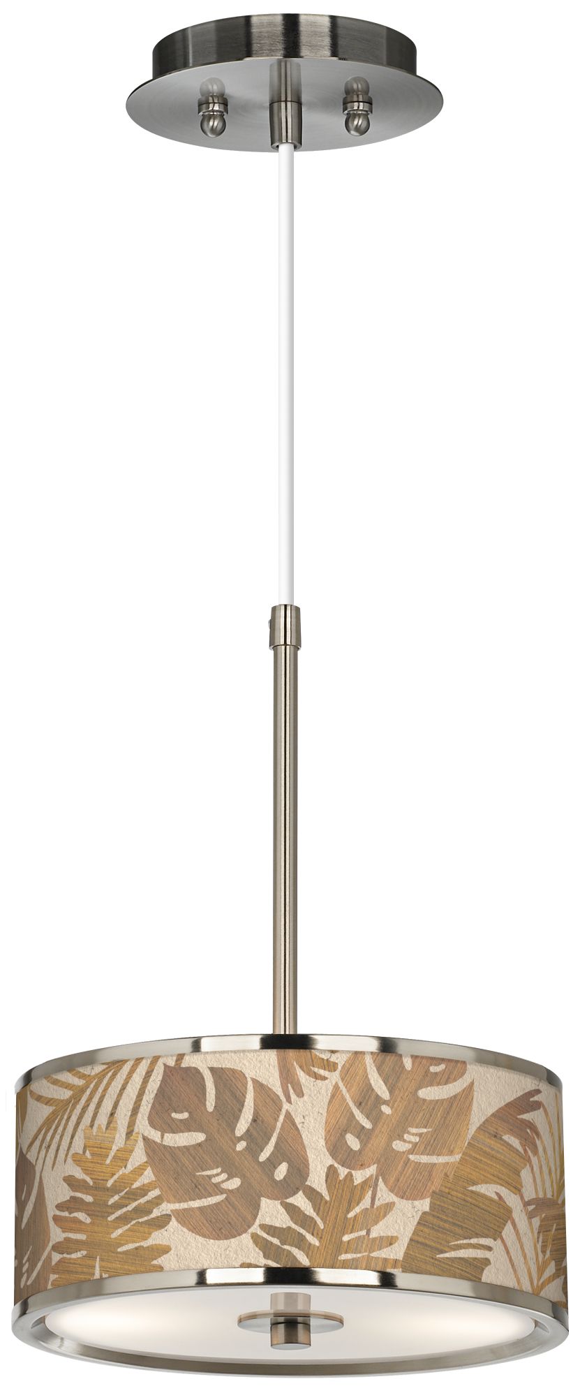 Add warmth and style to any room with this sophisticated and compact pendant light. The design features an exclusive Tropical Woodwork pattern giclee printed on a translucent lamp shade. This high-quality material allows warm light to shine through the shade, illuminating the pattern and creating a spectacular look. A white acrylic diffuser at the bottom prevents glare and provides even lighting. Includes energy efficient CFL bulbs. This stylish fixture is custom made-to-order. Shade printing process U.S. Patent # 7,347,593.