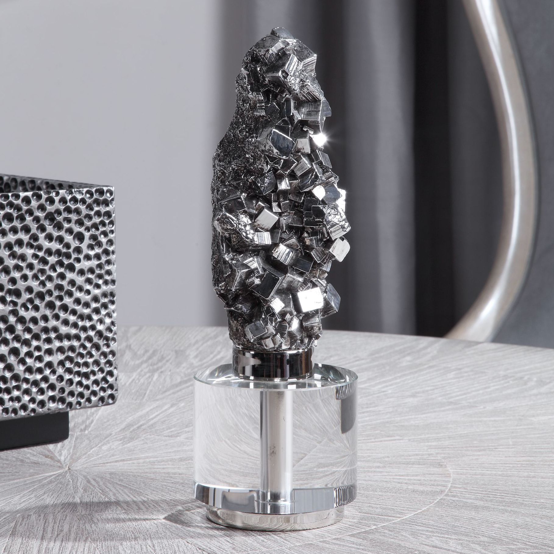 Intriguing artistic attitude puts a contemporary spin on classic abstract design. Choose this Pyrite modern abstract sculpture from Uttermost as a stylish, eye-catching boost to a modern table or mantel. A platinum silver finish top with rough texturizing contrasts with a delicate crystal base with steel accents. A study in experimental art personality, this sculpture sets its sights as a focal point.
