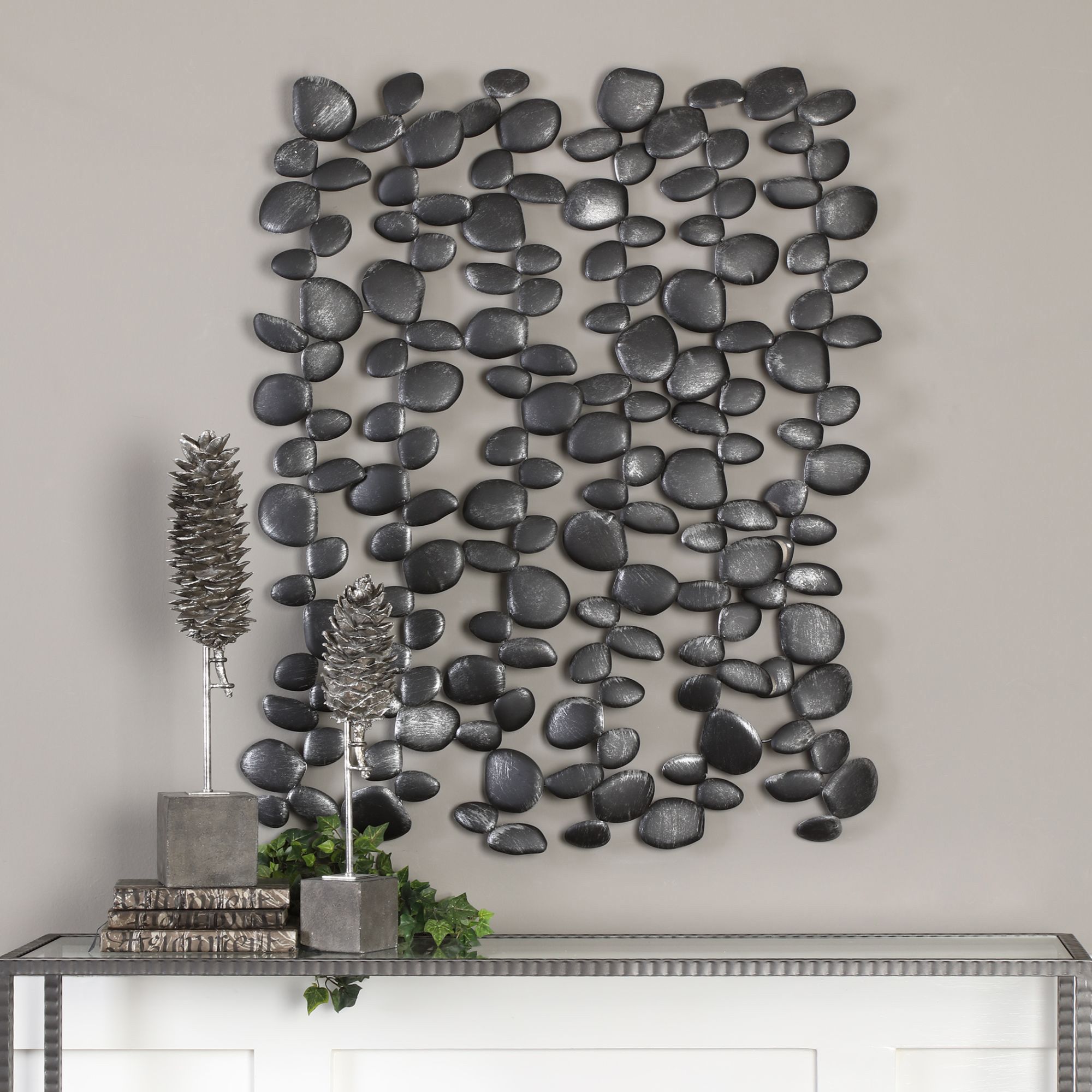 This wavy three-dimensional hand-forged iron wall art by Uttermost evokes images of skipping rocks across rippling pond waters. Crafted with smooth pebbles in a charcoal black finish with silver undertones, this engaging piece of wall art features hand-forged iron construction for years of enjoyment. Add it to your office or hallway for a dynamic effect.