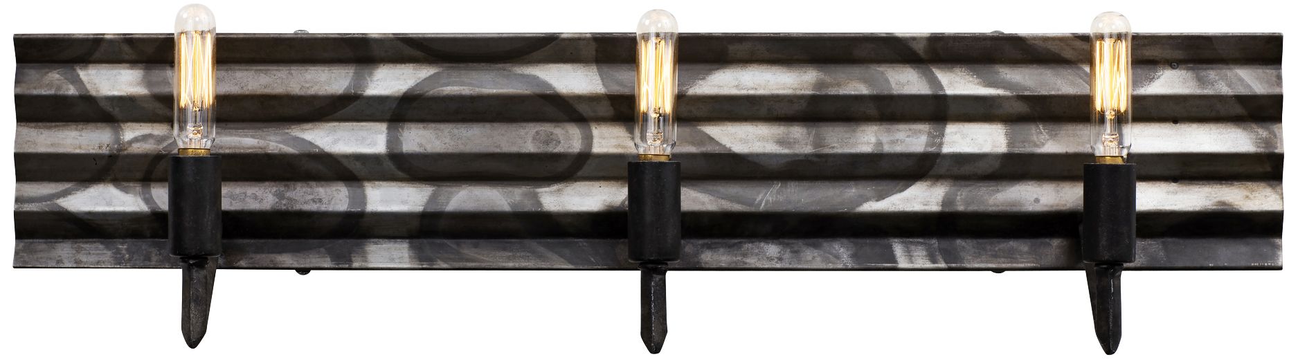 The hand-charred detail on the Flynne bath light by Varaluz gives each fixture one-of-a-kind detail. The fixture boasts galvanized steel with an ombre finish and three candelabra bulbs. Add it to your home or business for striking industrial style.