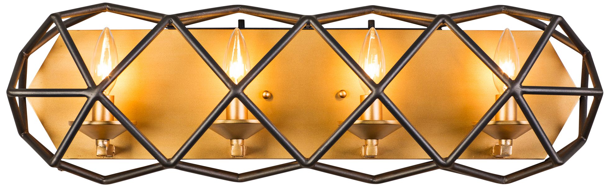 The Geo four-light bath light by Varaluz is made of hand-forged steel in a distinctive two-tone antique gold and rustic bronze finish. The fixture is a work of art, lending both light and style to your space. It marries triangles and polygons to give your room all the right angles.
