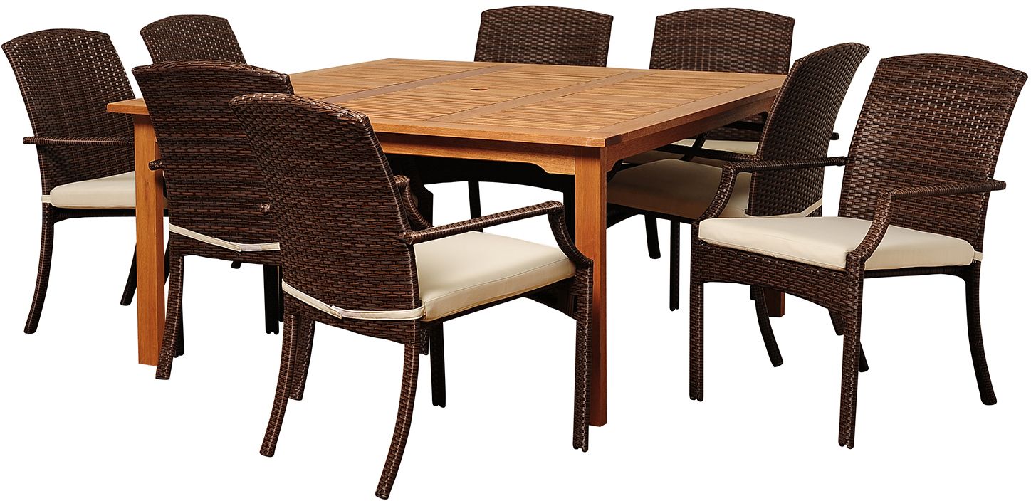 This all-weather outdoor dining set includes a natural finish eucalyptus wood square table and eight stackable brown synthetic wicker armchairs with soft off-white fabric cushions.