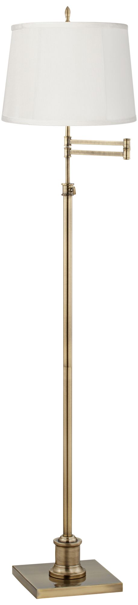 This transitional swing arm floor lamp offers your living space style and ideal illumination. The design features a thin profile base and arm. Adjust the arm and height as needed for reading and other tasks. Showcasing an antique brass finish, this contemporary lamp is topped with a beige fabric drum shade. From the 360 Lighting collection of floor lamps.