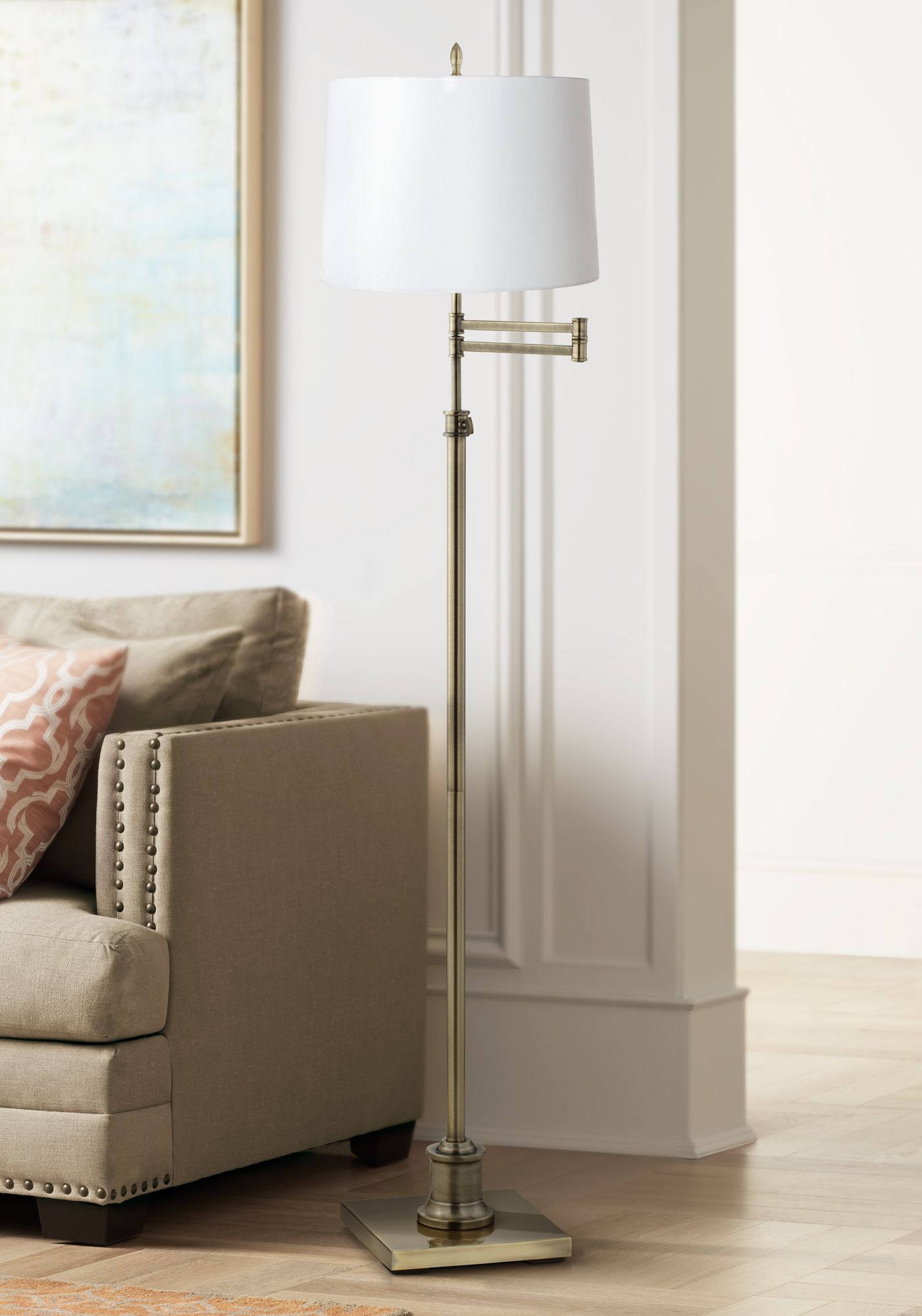 Featuring a thin profile base, this chic floor lamp's adjustable arm and height come in handy for reading and other tasks. Its white hardback shade is classically elegant. Tastefully accent your decor with this contemporary floor lamp's antique brass finish.