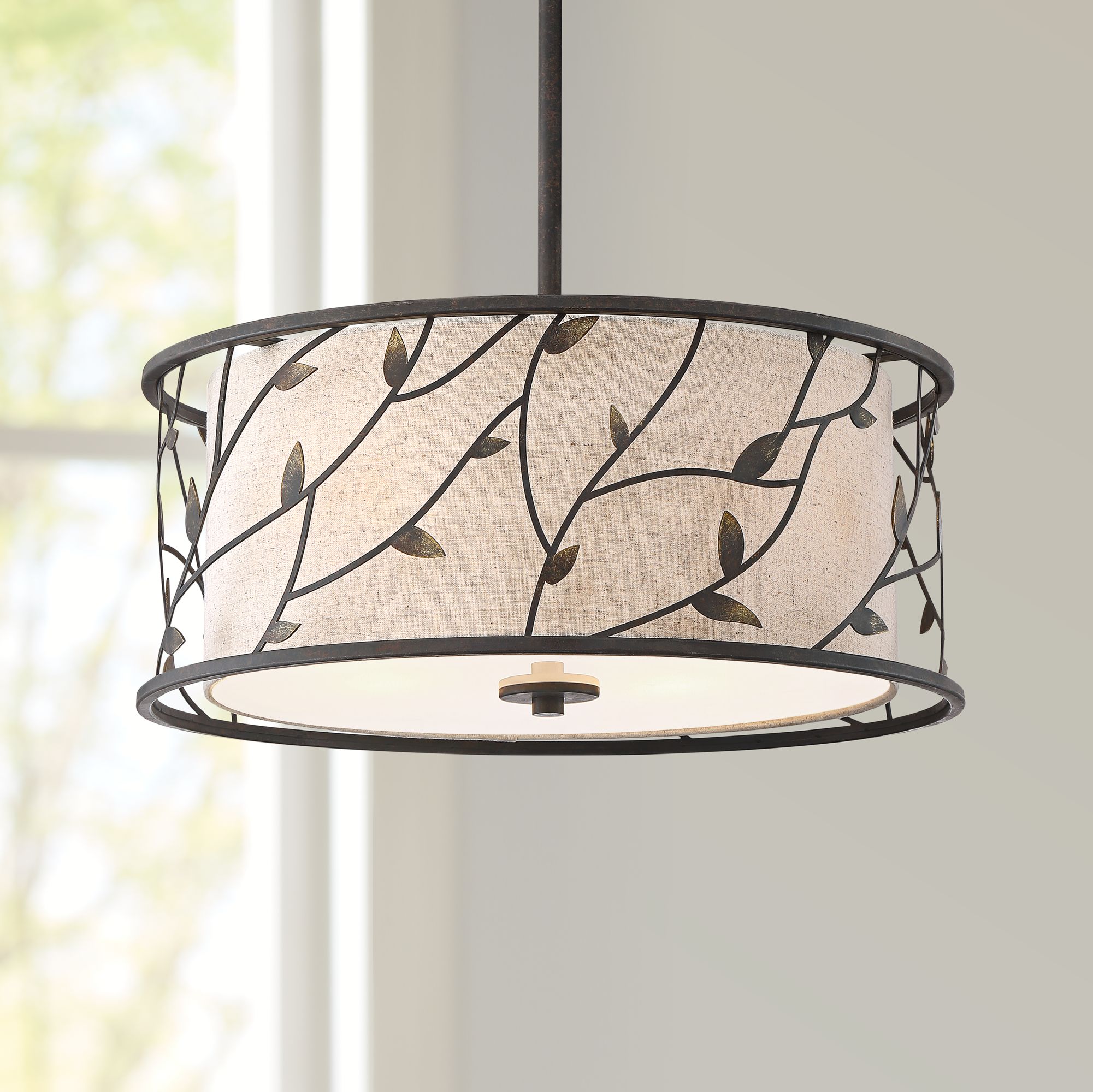 This four-light circular pendant features two layers. Its inner fabric shade is streamlined, and its metal exterior features an eye-catching pattern. A bronze finish is used to complement the metal layer.