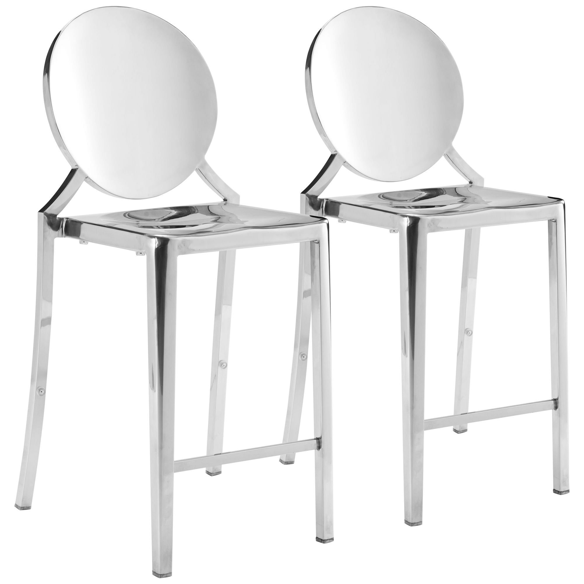 This set of two non-rotating, modern counter chairs is exactly the right fit for a chic kitchen or lounge. Each chair features stainless steel construction and finish, offering gleaming elegance to a modern space. Expertly designed by Zuo Modern, the set features rounded backs and contoured chairs that offer a lovely marriage of style and comfort.